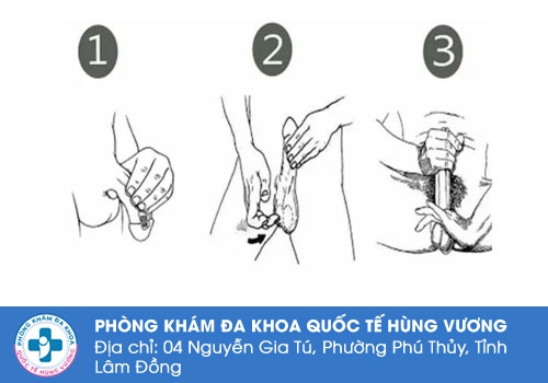 ⇒ Sử dụng tay rút bao quy đầu, đồng thời nắm lấy dương vật tại điểm cách đầu của dương vật khoảng 2cm.