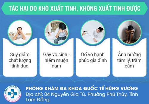 ► Ảnh hưởng tâm lý: Mỗi lần “lâm trận” không thể xuất tinh sẽ gây tâm lý khó chịu, nam giới dễ tự ti mặc cảm dễ bực tức, cáu gắt, tâm lý bị ức chế dẫn đến khó chịu; thậm chí là trầm cảm. Lâu dần dẫn đến rạn nứt tình cảm, đổ vỡ hôn nhân.