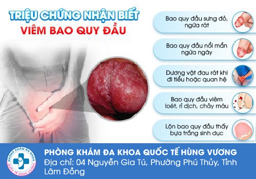 Khi tình trạng viêm bao quy đầu xảy ra, người bệnh sẽ xuất hiện các dấu hiệu: Bao quy đầu bị sưng tấy đỏ; ngứa ngáy ở đầu dương vật; xuất hiện tình trạng nổi mụn, mẩn đỏ, lở loét, chảy dịch có mùi hôi,...; có bựa trắng ở cậu nhỏ;...